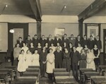 The Seattle Pacific College Chorus standing for a photo indoors.