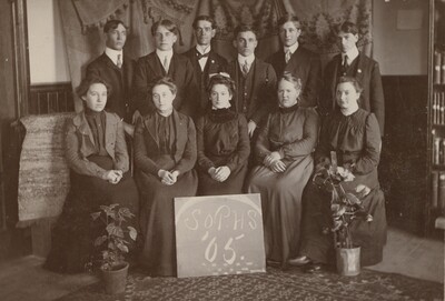A group of sophomore students sitting for a photo, behind a sign with the words "Sophs '05"