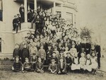 A group of students and faculty sits for a photo on the steps of ladies hall.