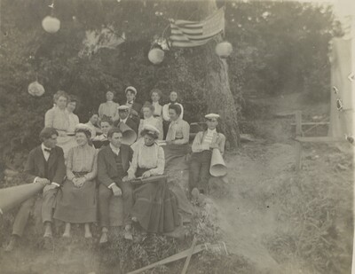 A group of students relaxing under some trees with party decorations and paraphernalia about.